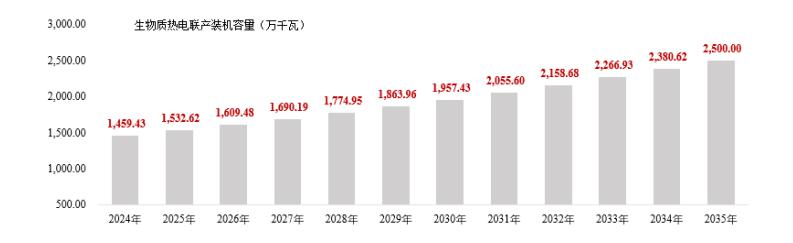 根據(jù)國(guó)家發(fā)展改革委、國(guó)家能源局發(fā)布的《關(guān)于促進(jìn)生物質(zhì)能供熱發(fā)展的指導(dǎo)意見(jiàn)》(發(fā)改能源[2017]2123號(hào)),到2035年,生物質(zhì)熱電聯(lián)產(chǎn)裝機(jī)容量超過(guò)2500萬(wàn)千瓦,生物質(zhì)能供熱在具備資源條件的地區(qū)實(shí)現(xiàn)普及應(yīng)用。根據(jù)該指導(dǎo)意見(jiàn)確定的目標(biāo),未來(lái)生物質(zhì)熱電聯(lián)產(chǎn)裝機(jī)容量預(yù)計(jì)發(fā)展情況如下: