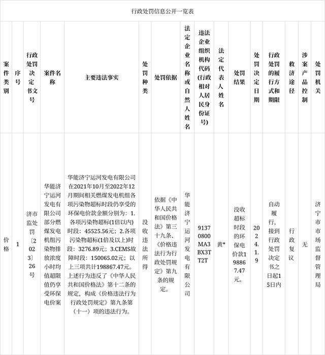 污染物超標享受環(huán)保電價,華能濟寧運河發(fā)電有限公司被沒收19.88萬