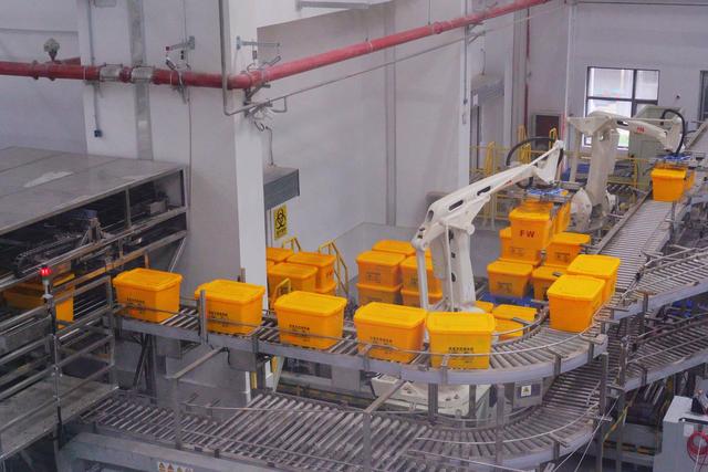 當(dāng)一輛裝載著醫(yī)療廢物的運(yùn)輸車(chē)進(jìn)入廠(chǎng)區(qū)后,車(chē)廂門(mén)一打開(kāi),負(fù)責(zé)卸貨的機(jī)械臂便迅速啟動(dòng),通過(guò)自身配備的攝像頭對(duì)周轉(zhuǎn)箱進(jìn)行拍照識(shí)別并完成自動(dòng)抓取,裝有醫(yī)療廢物的黃色周轉(zhuǎn)箱隨即被放置于輸送線(xiàn)上。為了保證各個(gè)環(huán)節(jié)的無(wú)縫對(duì)接,園區(qū)特別定制了24000個(gè)固定尺寸的周轉(zhuǎn)箱,確保從收集、運(yùn)輸?shù)教幚淼娜^(guò)程順利進(jìn)行。