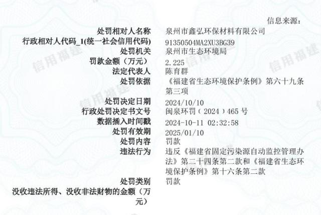 臺海網(wǎng)10月12日訊 根據(jù)泉州市生態(tài)環(huán)境局近日發(fā)布的行政處罰信息公開表(閩泉環(huán)罰(2024)465號)顯示,因當事人違反《福建省固定污染源自動監(jiān)控管理辦法》第二十四條第二款和《福建省生態(tài)環(huán)境保護條例》第十六條第二款,對泉州市鑫弘環(huán)保材料有限公司處以人民幣22250元罰款。