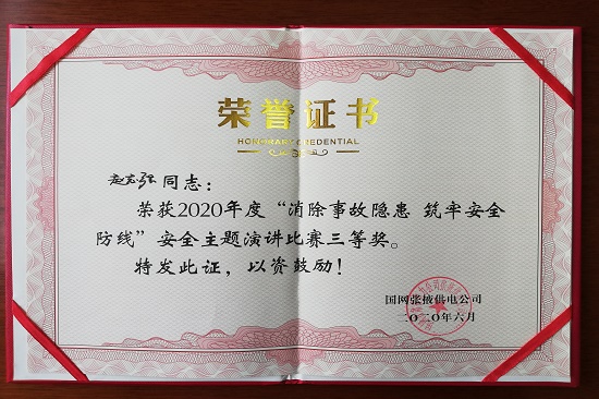 6月18日,該公司新入司大學(xué)生趙志強(qiáng)參加國(guó)網(wǎng)張掖供電公司安全生產(chǎn)月演講比賽,公司《從零開(kāi)始 向零奮斗》榮獲演講比賽三等獎(jiǎng)。