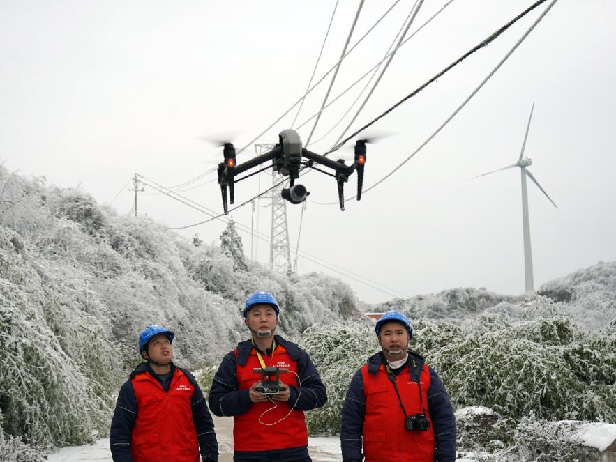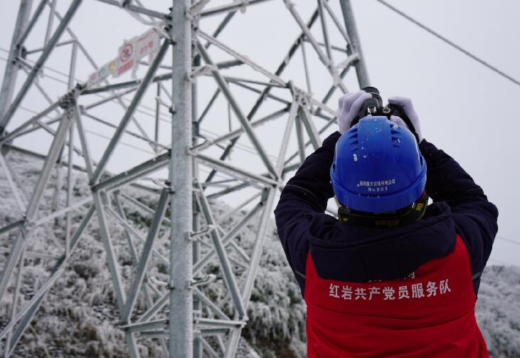 中國電力網(wǎng)訊 “110千伏四黎線今日最大覆冰厚度7.9毫米,目前風(fēng)速3.5米每秒,溫度零下4度……”“小心一點(diǎn),要走兩邊有草叢的地方,中間的道路結(jié)冰了,容易滑倒。”1月9日,國網(wǎng)重慶武隆供電公司輸電運(yùn)維檢修班成員吳鼎、趙樓等人來到武隆區(qū)和順鎮(zhèn)四眼坪鄉(xiāng)對(duì)覆冰線路開展特殊巡視。在白雪皚皚的四眼坪,國家電網(wǎng)紅巖共產(chǎn)黨員服務(wù)隊(duì)隊(duì)服的顏色成了冰雪世界里最靚麗的一抹紅,他們手拿著無人機(jī)、砍刀、繩索、望遠(yuǎn)鏡、風(fēng)速儀等設(shè)備再一次踏入他們熟悉的“冰雪戰(zhàn)場”。
