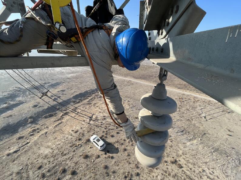 該處精心組織,提前對污染物較多的工業(yè)園區(qū)、礦場、發(fā)電廠等地進行實地勘察,結(jié)合污區(qū)分布圖選定取樣點位置,制定2022年鹽密測試計劃。鹽密取樣工作對作業(yè)人員的技術(shù)以及作業(yè)環(huán)境要求極為嚴格,此次取樣工作采取地電位作業(yè)方式,作業(yè)人員在鐵塔上既要與周圍帶電體保持足夠的安全距離,還要對取樣絕緣子進行精細操作,作業(yè)人員具備出色的身體素質(zhì)和心理素質(zhì),配合默契,圓滿完成工作。