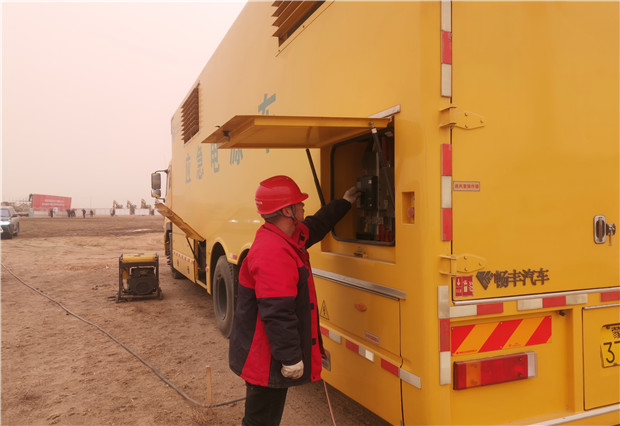 開工儀式當天沙塵天氣持續(xù),揚沙隨風彌漫,突擊隊的保電人員不辭辛苦一大早便提前進入會場。將發(fā)電車??吭谇捌诓榭钡闹付ㄎ恢茫龊冒踩O(jiān)護相關的工作之后,啟動車輛試運行,檢查了各項儀表數(shù)據(jù),并做好與用戶側供電設備的對接,全力以赴投入保電工作。該分局領導帶領保電人員全程守候在現(xiàn)場,隨時應對突發(fā)停電事故的發(fā)生,確保了開工儀式用電萬無一失。