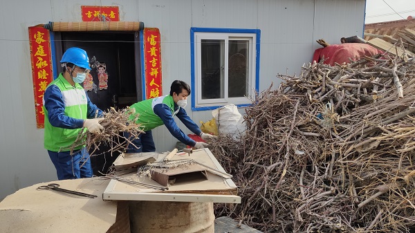 志愿者首先對(duì)老人家中用電設(shè)備和線路進(jìn)行了檢查,通過(guò)檢查發(fā)現(xiàn)接戶線老化嚴(yán)重,部分絕緣層已經(jīng)破損,存在一定安全隱患。發(fā)現(xiàn)該情況,志愿者立即與烏力吉營(yíng)業(yè)所溝通,準(zhǔn)備工器具和導(dǎo)線為其重新更換接戶線,消除了安全隱患。隨后,志愿者來(lái)到老人家院外,幫助她撿拾樹(shù)枝,劈開(kāi)后送到院內(nèi)充當(dāng)柴禾,并幫老人對(duì)小院子進(jìn)行了打掃。最后志愿者為老人送上米面油等生活用品和真摯的祝福。