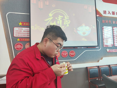 緊接著,趣味小游戲的開始又將整場活動(dòng)掀起另一個(gè)高潮。為冬奧會(huì)吉祥物“冰墩敦”貼眼睛,展現(xiàn)了職工團(tuán)隊(duì)協(xié)作能力;“扮時(shí)鐘”體現(xiàn)了職工對(duì)時(shí)間觀念的認(rèn)知;最后的“聲聲報(bào)福”展現(xiàn)了職工的配合默契程度。歡聲笑語過后,大家每人一碗熱乎乎湯圓,寓意著“團(tuán)團(tuán)圓圓”,同時(shí)也祝愿全體職工在新的一年里能夠更加團(tuán)結(jié)奮進(jìn),砥礪前行。