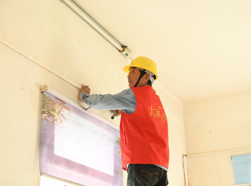 當(dāng)天,根據(jù)前期方案,志愿者把露在墻上的舊線全部拆除,鋪設(shè)新線、套進(jìn)線管,并將其牢牢地固定在墻上,運(yùn)用各種兩通、三通接頭使整個(gè)線路看起來(lái)橫平豎直,美觀大方。同時(shí),每個(gè)出線口都裝上插座和開(kāi)關(guān)底座,便于墻面粉刷完畢后進(jìn)行插座和開(kāi)關(guān)安裝。