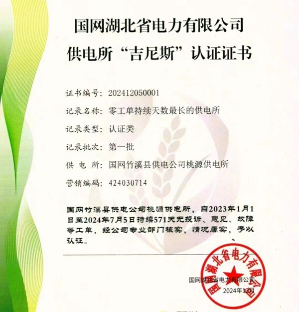 中國(guó)電力網(wǎng)訊(通訊員 黃耀成、郭旭) 日前,從國(guó)網(wǎng)湖北省電力有限公司傳來(lái)喜訊,繼去年國(guó)網(wǎng)竹溪縣供電公司匯灣供電所喜獲國(guó)網(wǎng)十堰供電公司“四星級(jí)鄉(xiāng)鎮(zhèn)供電所”授牌后,今年國(guó)網(wǎng)竹溪縣供電公司桃源供電所又獲國(guó)網(wǎng)湖北省電力有限公司頒發(fā)的零工單位持續(xù)天數(shù)最長(zhǎng)的供電所“吉尼斯”認(rèn)證證書(shū),這是該公司強(qiáng)化從業(yè)紀(jì)律,擦亮服務(wù)窗口,電業(yè)清風(fēng)為民的真實(shí)寫(xiě)照。