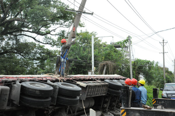 中國電力網(wǎng)訊 9月19日上午9點20分,由于一場意外的交通事故,10千伏夢谷線76#桿被一輛側(cè)翻的貨車壓倒。而10千伏夢谷線主要承擔廣昌縣夢谷電商創(chuàng)業(yè)園以及附近答田村數(shù)個村小組的供電任務(wù),情況緊急,國網(wǎng)廣昌縣供電公司甘竹供電所在接到搶修工單的第一時間立即啟動應(yīng)急搶修預(yù)案,組織了一只數(shù)十人的搶修隊伍前往事故發(fā)生地點,并在趕往現(xiàn)場的同時,安排相關(guān)臺區(qū)管理員做好停電用戶解釋工作。