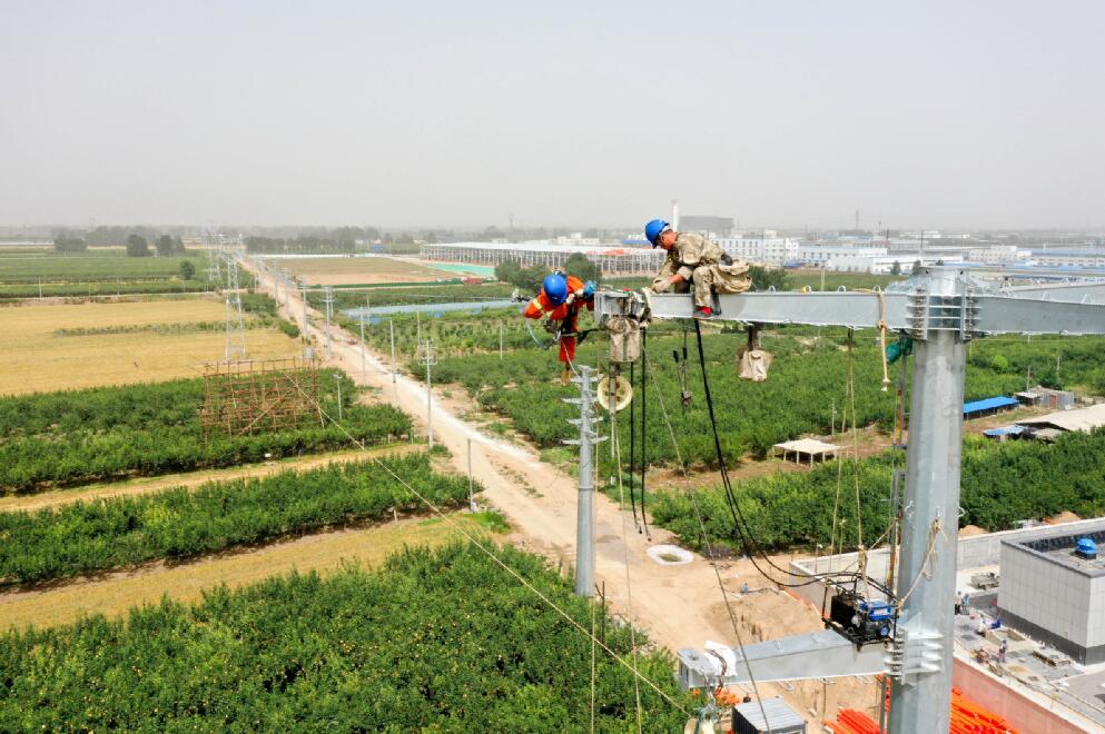 近日,河北省石家莊晉州市氣溫持續(xù)攀升,在河北石家莊晉州園區(qū)110千伏輸變電線路工程施工現(xiàn)場(chǎng),國(guó)網(wǎng)石家莊供電公司的50多名施工人員正在有條不紊地開(kāi)展張力放線施工作業(yè)。