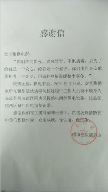 章里集供電所所長(zhǎng)吳超接過重量雖輕卻又意義非凡的感謝信后激動(dòng)地說:“謝謝你們對(duì)我們工作的肯定,疫情戰(zhàn)場(chǎng)上,是你們白衣天使沖鋒在前。作為國(guó)家電網(wǎng)人,我們更要發(fā)揚(yáng)頂?shù)蒙稀⒖康米?、打得贏得電力鐵軍精神,攜手打贏這場(chǎng)沒有硝煙的戰(zhàn)疫!”