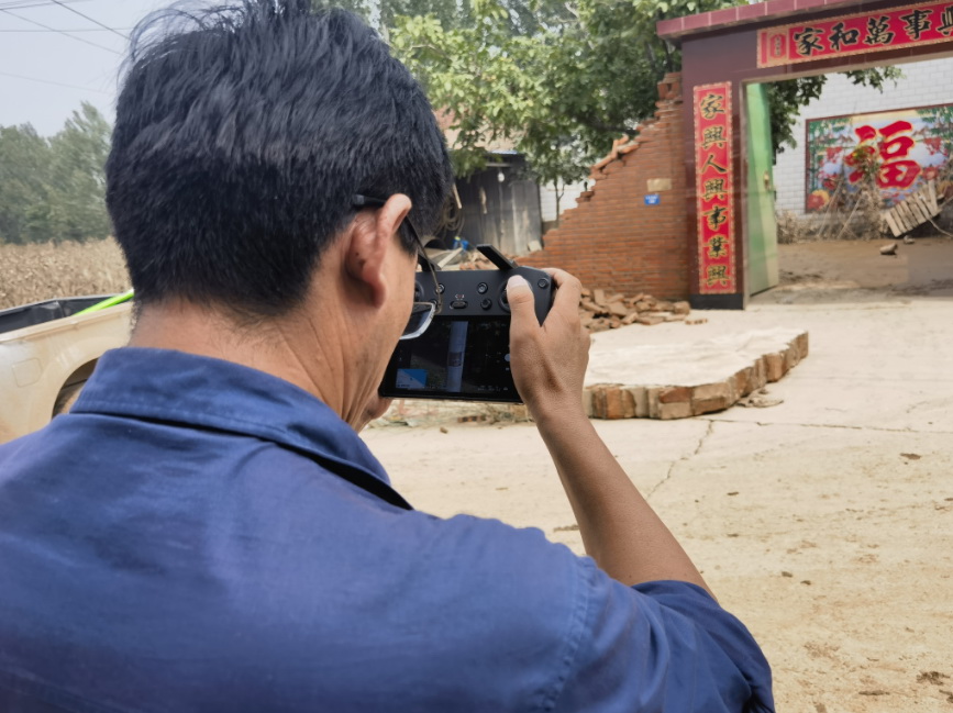 目前農(nóng)村部分地區(qū)水還未退,河北保定涿州供電公司刁窩供電所員工用無人機(jī)巡查倒桿情況,為接下來的重建做準(zhǔn)備。(陸暢)