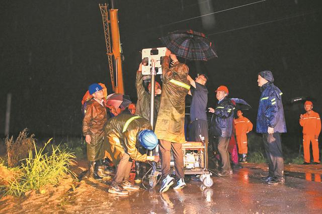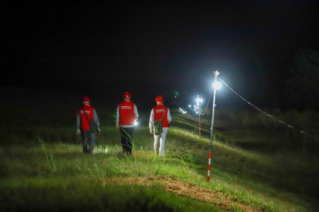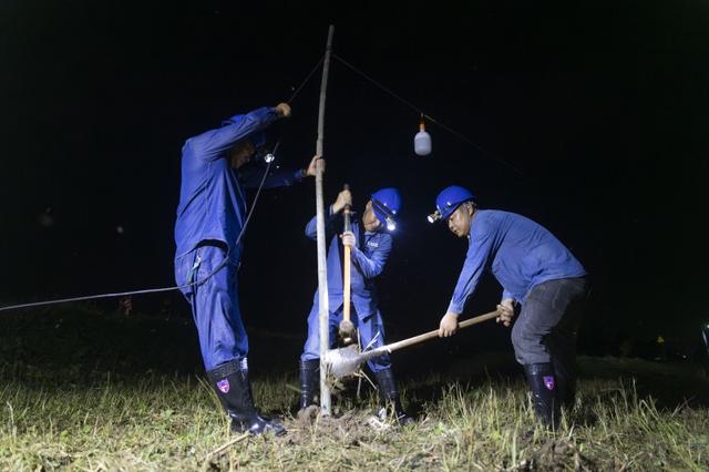 運輸材料、組裝燈泡、打樁架線、爬桿送電……突擊隊員們克服雜草叢生、滿是泥濘的不利工作條件,于7月1日6時“點亮”江心鄉(xiāng)堤壩。據(jù)統(tǒng)計,突擊隊員們共計安裝防雨戶外燈300余盞,敷設(shè)照明臨時線路約12千米。