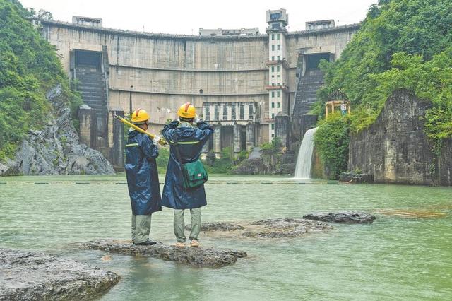 國網(wǎng)湖北恩施宣恩縣供電公司員工冒雨查看龍洞電站大壩庫區(qū)水情。