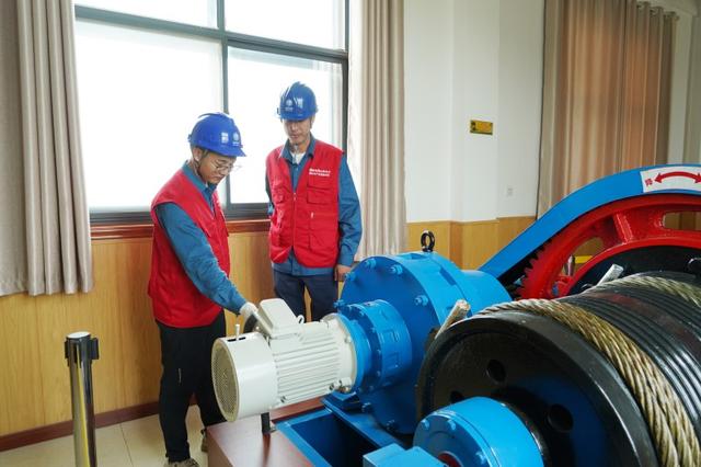 國家電網(wǎng)山東電力彩虹共產(chǎn)黨員服務(wù)隊隊員檢查許家崖水庫泄洪機(jī)組運行情況。