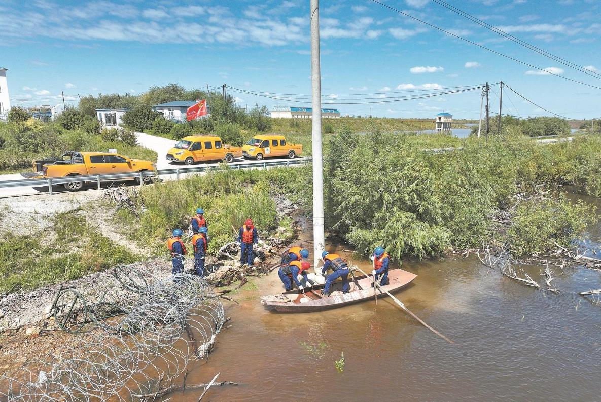 8月14日,黑龍江佳木斯供電公司員工在烏蘇鎮(zhèn)加固10千伏廣場(chǎng)線(xiàn)131號(hào)電桿基礎(chǔ),保障線(xiàn)路安全運(yùn)行。吳迪 攝