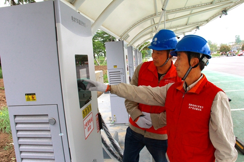 中國電力網(wǎng)訊 5月13日,江蘇連云港市東??h供電公司駝峰供電所服務(wù)人員趙孫華、何文軍在縣開發(fā)區(qū)花卉市場門前檢查電動汽車充電樁運行情況。
