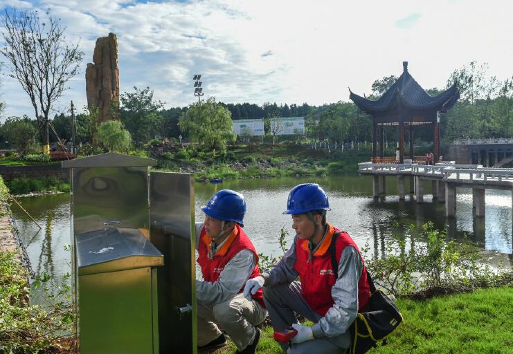 7月18日,在安徽省定遠(yuǎn)縣西卅店鎮(zhèn)“金山溪谷”旅游景點(diǎn),國(guó)網(wǎng)滁州供電公司皖美共產(chǎn)黨員服務(wù)隊(duì)員楊海榮、王培雨等對(duì)景區(qū)用電設(shè)備開(kāi)展安全檢查,保障游客人身安全。