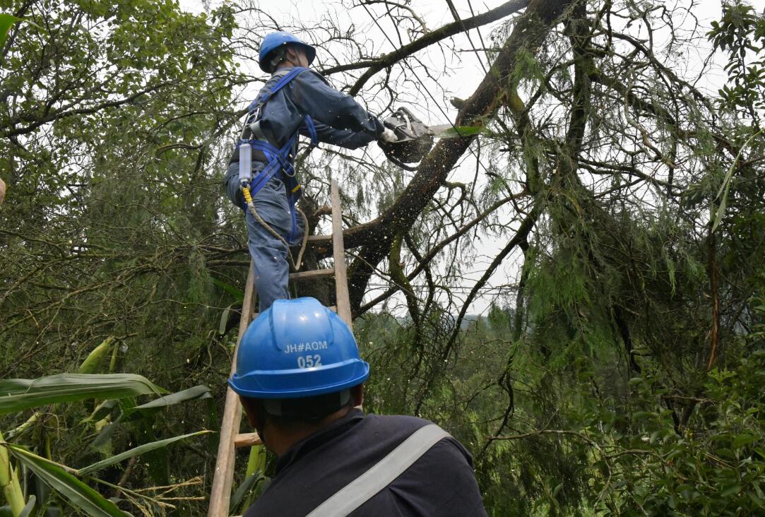 在搶修現(xiàn)場,在做好一系列安全措施以后,配電中心搶修人員用油鋸鋸斷搭在線路的樹木,再登上電桿,拆除原來的線路和刀閘,隨后更換故障刀閘,重新架設線路,恢復送電……搶修中,工作人員克服雨天路滑、天氣暴熱、搶修不易等困難,同時在當?shù)卮迕竦亩αχС窒拢?jīng)過三個小時的艱苦鏖戰(zhàn),所有搶修工作圓滿落下帷幕。