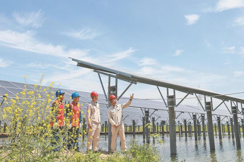 2024年4月25日,黨員服務(wù)隊隊員和肥東縣晶斗光伏電站員工共同巡檢發(fā)電設(shè)備。陳海東 攝