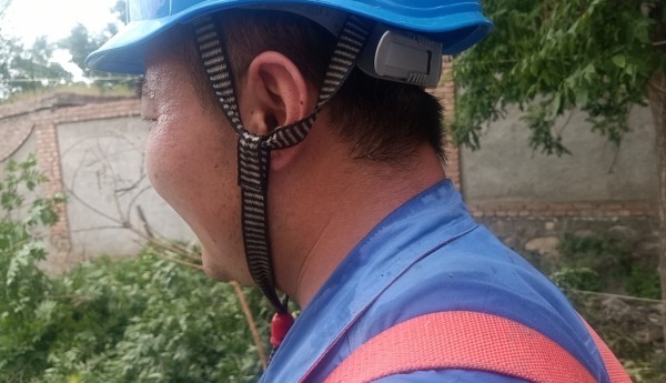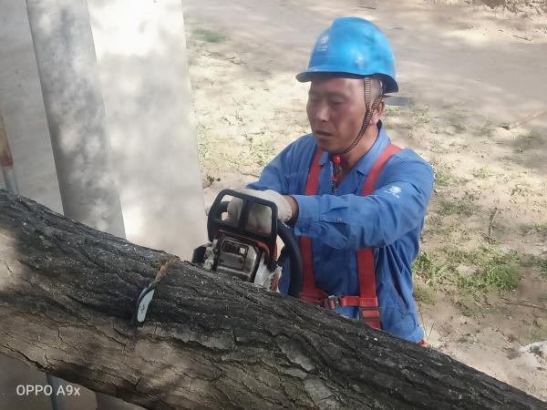在現(xiàn)場,工作電鋸的呲呲聲、斧頭的敲打聲、腳扣攀登電桿的噠噠聲......每位工作人員全然顧不上天氣的悶熱,井然有序的全身心投入,“高空”開展伐樹、修剪作業(yè),不一會(huì)汗水就濕透了衣背。