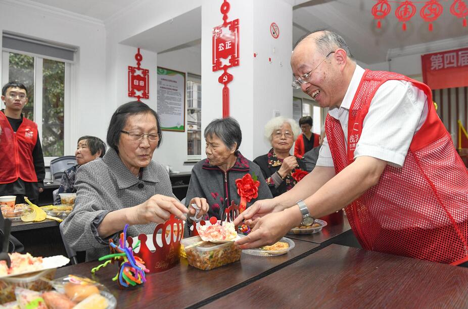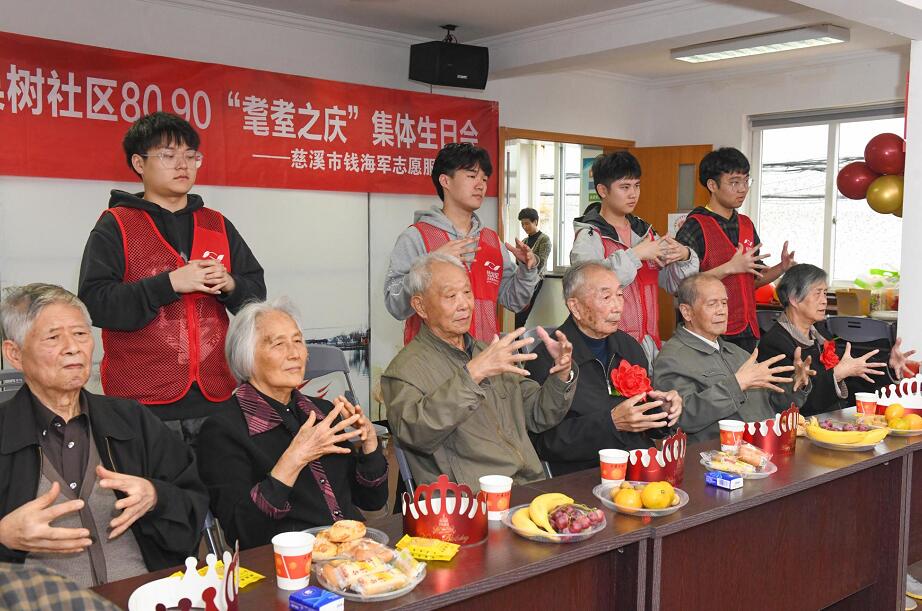 這是慈溪市白果樹社區(qū)第四屆“8090”耄耋老人集體生日會的現(xiàn)場。在重陽節(jié)來臨之際,浙江慈溪市錢海軍志愿服務(wù)中心攜同白果樹社區(qū)和寧波大學(xué)科學(xué)技術(shù)學(xué)院,為社區(qū)內(nèi)30余名80歲以上老人們準備了蛋糕、壽面和精彩的節(jié)目表演,提前給老人們過一個集體生日。