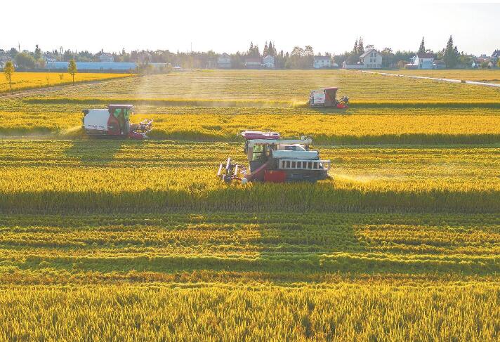 10月30日,在江蘇省海安市開(kāi)發(fā)區(qū)品建村的洋蠻河高標(biāo)準(zhǔn)農(nóng)田示范區(qū),南通季和智慧農(nóng)業(yè)有限公司的1800多畝水稻收割工作有序進(jìn)行。俯瞰大地,金黃的稻田綿延成片,多臺(tái)收割機(jī)穿梭其中。