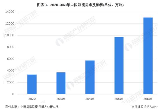 根據(jù)中國氫能聯(lián)盟的預(yù)測,2020 年以后中國氫能需求將持續(xù)增加,尤其是 2030 年以后,為達成 " 碳中和、碳達峰 " 的目標,氫能需求量將大增。到 2060 年,中國氫能年需求將超過 1.3 億噸。