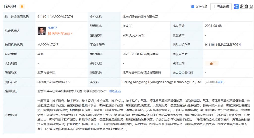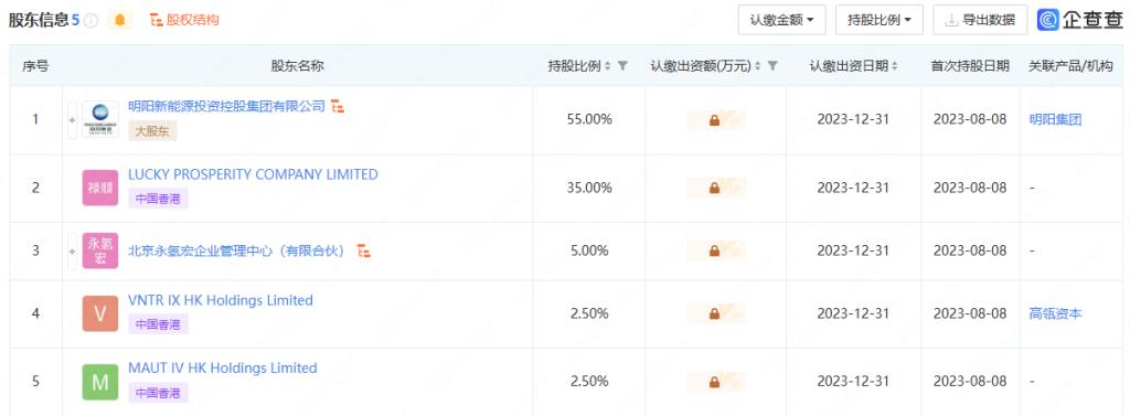 據(jù)企查查顯示,8 月 8 日,北京明陽氫能科技有限公司注冊(cè)成立,該公司注冊(cè)資本 2000 萬元,由風(fēng)電龍頭企業(yè)明陽集團(tuán)、祿順有限公司(LUCKY PROSPERITY COMPANY LIMITED)、北京永氫宏企業(yè)管理中心 ( 有限合伙 ) 等多家單位共同持股,其中明陽集團(tuán)持有 55% 股份、為最大股東,明陽集團(tuán)董事長(zhǎng)張傳衛(wèi)擔(dān)任該公司法定代表人。