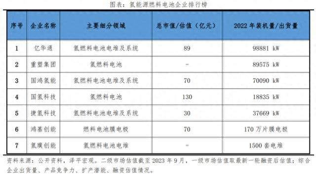 國(guó)鴻氫能,氫燃料電池產(chǎn)品和系統(tǒng)解決方案龍頭,2022年燃料電池系統(tǒng)新增獨(dú)角獸。估值70億元,嘗試港股IPO,有望成為繼億華通之后第二家在香港上市的氫燃料電池企業(yè)。市場(chǎng)表現(xiàn)看,公司的燃料電池技術(shù)已廣泛應(yīng)用于交通、分布式發(fā)電等領(lǐng)域的商業(yè)化落地,子公司鴻力氫動(dòng)2022年燃料電池系統(tǒng)裝機(jī)量超過6萬(wàn)千瓦,市占率15%,排名第三。產(chǎn)品優(yōu)勢(shì)看,公司已實(shí)現(xiàn)核心原材料與生產(chǎn)裝備的國(guó)產(chǎn)化及生產(chǎn)制造的高質(zhì)量規(guī)模化,氫燃料電池電堆生產(chǎn)設(shè)施全球領(lǐng)先。