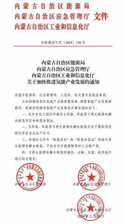 通知明確,允許在化工園區(qū)外建設(shè)太陽(yáng)能、風(fēng)能等可再生能源電解水制氫項(xiàng)目和制氫加氫站。太陽(yáng)能、風(fēng)能等可再生能源電解水制氫項(xiàng)目不需取得危險(xiǎn)化學(xué)品安全生產(chǎn)許可。可再生能源電解水制氫的儲(chǔ)存、運(yùn)輸、充裝、使用執(zhí)行現(xiàn)行相關(guān)規(guī)定。