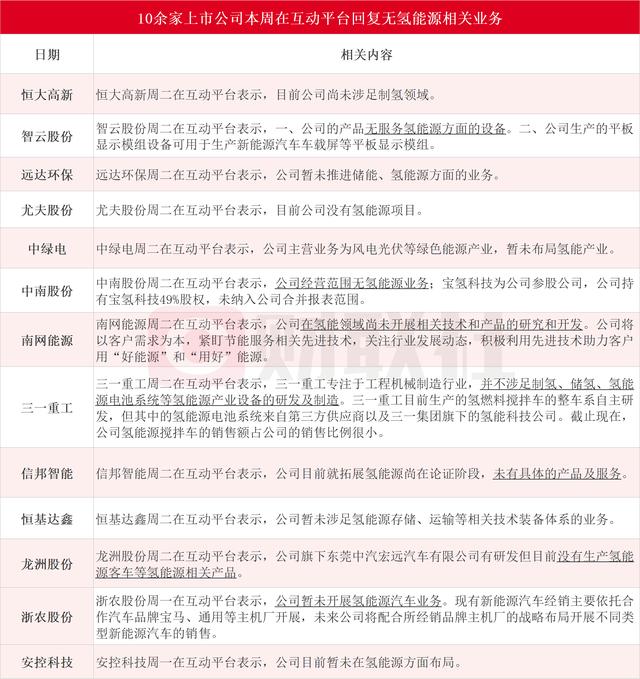 據(jù)財(cái)聯(lián)社不完全統(tǒng)計(jì),恒大高新、智云股份、遠(yuǎn)達(dá)環(huán)保、尤夫股份、中綠電、中南股份、南網(wǎng)能源、三一重工、信邦智能、恒基達(dá)鑫、龍洲股份、浙農(nóng)股份和安控科技在內(nèi)的13家上市公司本周在互動(dòng)平臺(tái)無氫能源相關(guān)業(yè)務(wù)。具體情況如下圖: