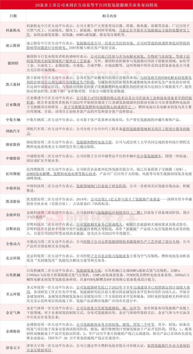 據(jù)財(cái)聯(lián)社不完全統(tǒng)計(jì),科新機(jī)電、凌云股份、德固特、凱立新材、泛亞微透、中集車輛、國機(jī)汽車、駱駝股份、中儲(chǔ)股份、億緯鋰能、中核科技、凱龍股份、金能科技、昇輝科技、全柴動(dòng)力、北京科銳、石化機(jī)械、圣元環(huán)保、金宏氣體、金博股份和津榮天宇在內(nèi)的21家上市公司本周在互動(dòng)易等平臺(tái)回復(fù)氫能源相關(guān)業(yè)務(wù)情況。其中,德固特今日發(fā)布投資者機(jī)構(gòu)調(diào)研時(shí)表示,公司目前已經(jīng)參與并為制氫領(lǐng)域客戶提供過工藝裝備。凱立新材今日在互動(dòng)平臺(tái)表示,公司在氫產(chǎn)業(yè)鏈布局的項(xiàng)目進(jìn)展具體為:與制氫相關(guān)的PEM電解水制氫催化劑的在研項(xiàng)目達(dá)到完成百克級(jí)穩(wěn)定生產(chǎn)階段。具體情況如下圖: