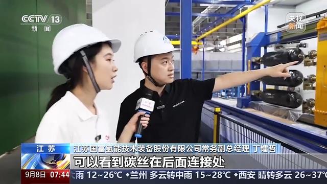 江蘇國富氫能技術(shù)裝備股份有限公司常務(wù)副總經(jīng)理 丁鐳哲:這里是我們的核心工藝之一,碳纖維纏繞。你可以看到碳絲在后面連接處,就像一個織布機(jī)一樣,一層一層往上織。碳纖維主要是用來承壓的。