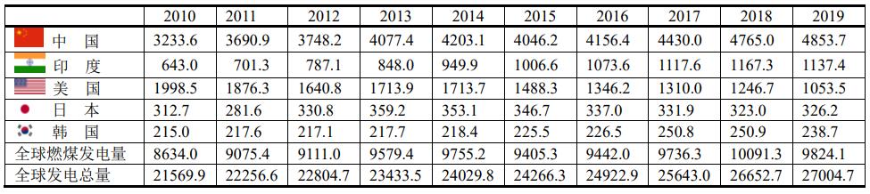 2010~2019年燃煤發(fā)電前五位國家狀況(單位:TWh)
