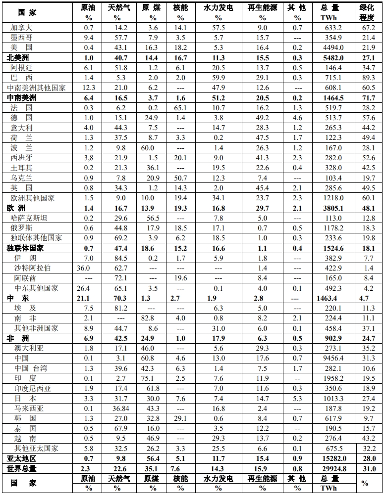 電力結(jié)構(gòu)是指電力來自一次能源的比例,由于各國(guó)所處的地理位置不同,資源貧富程度各不相同,甚至相差甚遠(yuǎn),這就構(gòu)成了世界各國(guó)各不相同的電力結(jié)構(gòu)。為了全面理解各個(gè)國(guó)家的電力結(jié)構(gòu),本文采用兩種形式來表示:⑴ 用各國(guó)一次能源生產(chǎn)的電力(TWh)來表示;⑵ 將各國(guó)一次能源生產(chǎn)的電力化為百分率來觀察電力綠化程度。