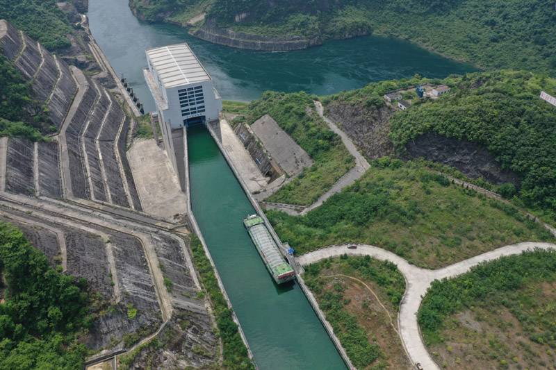 6月22日,500噸級(jí)貨船“航電1號(hào)”在烏江構(gòu)皮灘水電站通航工程內(nèi)進(jìn)行試運(yùn)行(無人機(jī)照片)。