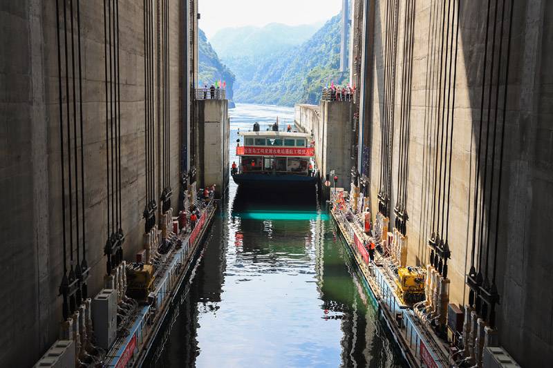 當(dāng)日,位于貴州省遵義市余慶縣境內(nèi)的烏江構(gòu)皮灘水電站通航工程開始試運(yùn)行。構(gòu)皮灘水電站通航工程線路總長2306米,由上下游引航道、三級(jí)垂直升船機(jī)和兩級(jí)中間渠道組成。投入試運(yùn)行后,500噸級(jí)船舶可從貴陽的開陽碼頭依次通過構(gòu)皮灘、思林、沙沱、彭水,在重慶涪陵進(jìn)入長江。