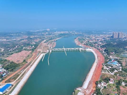 樞紐電站共配備4臺單機容量8.5MW燈泡貫流式水輪發(fā)電機組,轉輪直徑4.7m,總裝機34MW,電站廠房布置于右岸河床,計劃2024年4月全部機組投產發(fā)電,設計年均發(fā)電量可達1.15億度。