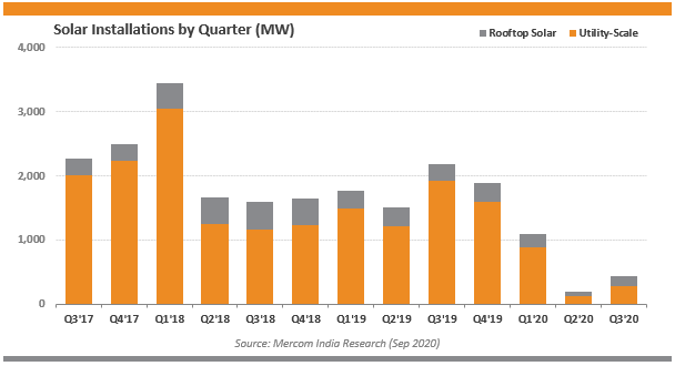 隨著疫情導(dǎo)致的全國范圍封鎖開始逐漸放寬,印度經(jīng)濟(jì)也開始緩慢復(fù)蘇。太陽能行業(yè)也因此受到積極的影響,三季度裝機(jī)容量明顯好于上一季度。但是,該行業(yè)仍然有很長的路要走,四季度的部分項目調(diào)試日期已被批準(zhǔn)延期至2021年上半年。