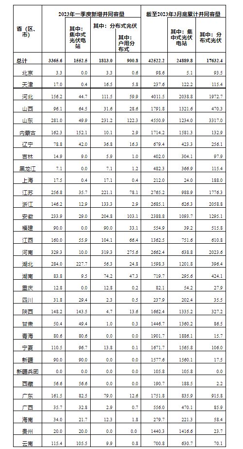 據(jù)國家能源局消息,國家能源局公布2023年一季度光伏發(fā)電建設(shè)運行情況。一季度新增并網(wǎng)容量3365.6萬千瓦。其中,集中式光伏電站1552.5萬千瓦,分布式光伏1813.0萬千瓦。截至2023年3月底累計并網(wǎng)容量42522.2萬千瓦。