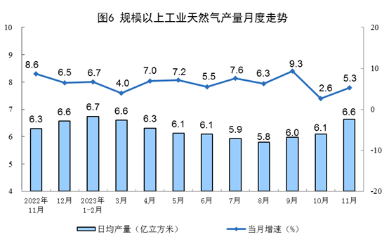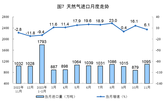 1—11月份,生產(chǎn)天然氣2096億立方米,同比增長(zhǎng)6.0%。進(jìn)口天然氣10740萬(wàn)噸,同比增長(zhǎng)8.5%。