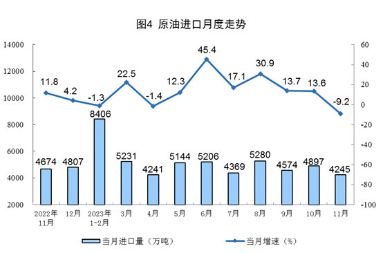 原油生產(chǎn)增速加快,進(jìn)口增速由增轉(zhuǎn)降。11月份,生產(chǎn)原油1720萬(wàn)噸,同比增長(zhǎng)2.6%,增速比10月份加快2.1個(gè)百分點(diǎn),日均產(chǎn)量57.3萬(wàn)噸。進(jìn)口原油4245萬(wàn)噸,同比下降9.2%,10月份為增長(zhǎng)13.6%。