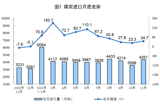 1—11月份,生產(chǎn)原煤42.4億噸,同比增長(zhǎng)2.9%。進(jìn)口煤炭4.3億噸,同比增長(zhǎng)62.8%。