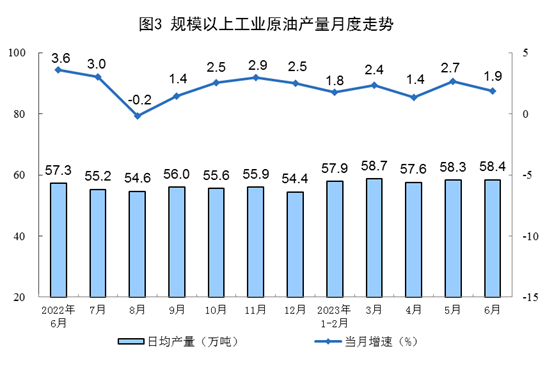 原油生產(chǎn)保持平穩(wěn),進(jìn)口快速增長(zhǎng),原油加工較快增長(zhǎng)。上半年,生產(chǎn)原油10505萬(wàn)噸,同比增長(zhǎng)2.1%。進(jìn)口原油28208萬(wàn)噸,同比增長(zhǎng)11.7%。加工原油36358萬(wàn)噸,同比增長(zhǎng)9.9%。6月份,生產(chǎn)原油1752萬(wàn)噸,同比增長(zhǎng)1.9%。加工原油6095萬(wàn)噸,同比增長(zhǎng)10.2%。