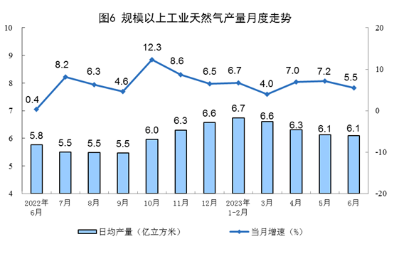 天然氣生產(chǎn)平穩(wěn)增長(zhǎng),進(jìn)口增速較快。上半年,生產(chǎn)天然氣1155億立方米,同比增長(zhǎng)5.4%。進(jìn)口天然氣5663萬(wàn)噸,同比增長(zhǎng)5.8%。6月份,生產(chǎn)天然氣183億立方米,同比增長(zhǎng)5.5%。