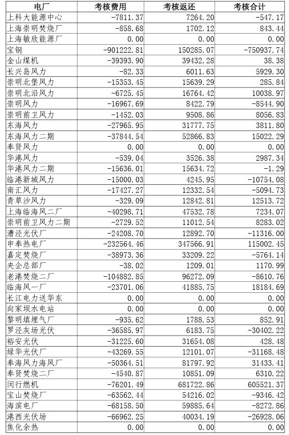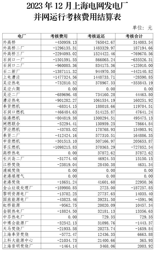 2023年10-12月上海電網發(fā)電廠并網運行考核費用結算表