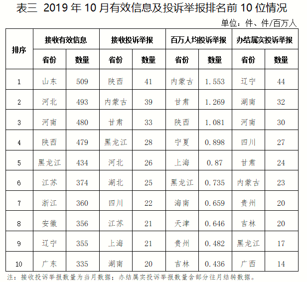 各?。ㄗ灾螀^(qū)、直轄市)按照收到的有效信息數(shù)量排序,山東、河北、河南、陜西、黑龍江等列全國(guó)前10位;按照投訴舉報(bào)數(shù)量排序,陜西、內(nèi)蒙古、甘肅、黑龍江、河北等排在全國(guó)前10位;按照百萬(wàn)人均投訴舉報(bào)數(shù)量排序,內(nèi)蒙古、甘肅、陜西、寧夏、上海等排在全國(guó)前10位;按照辦結(jié)屬實(shí)投訴舉報(bào)數(shù)量排序,遼寧、湖南、河南、四川、甘肅等排在全國(guó)前10位。(2019年10月有效信息及投訴舉報(bào)排名前10位情況見(jiàn)表三)