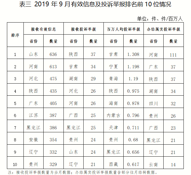 各?。ㄗ灾螀^(qū)、直轄市)按照收到的有效信息數(shù)量排序,山東、河南、河北、陜西、廣東等排在全國前10位;按照投訴舉報數(shù)量排序,陜西、甘肅、湖南、河北、河南等排在全國前10位。按照百萬人均投訴舉報數(shù)量排序,甘肅,寧夏,青海,陜西,海南等排在全國前10位。按照辦結屬實投訴舉報數(shù)量排序,河南、廣東、陜西、湖南、四川等排在全國前10位。(2019年9月有效信息及投訴舉報排名前10位情況見表三)