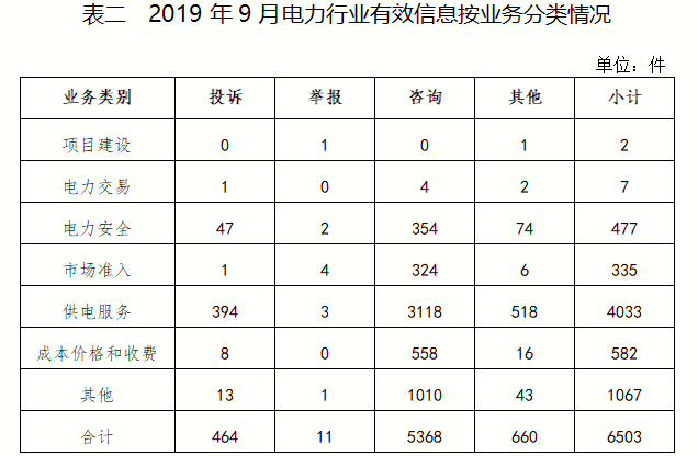 電力行業(yè)排在首位,有效信息數(shù)量為6503件,占全部有效信息的77.62%;其中受理的投訴舉報數(shù)量為475件,占全部投訴舉報數(shù)量的94.81%。群眾反映的問題主要集中在供電服務、電力安全、成本價格和收費等方面。(2019年9月電力行業(yè)有效信息按業(yè)務分類情況見表二)